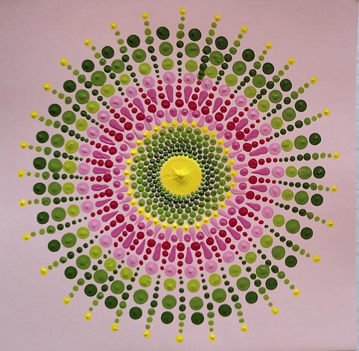 Das Dot-Painting-Mandala entsteht aus der Mitte, stärkt den Fokus und die Feinmotorik und kann die Harmonie, inspiration und die Verbindung zu sich selbst verstärken. Das Punkt für Punkt malen kann eine heilsame Wirkung entfalten, da es fokussiert, ordnet und Freude macht.