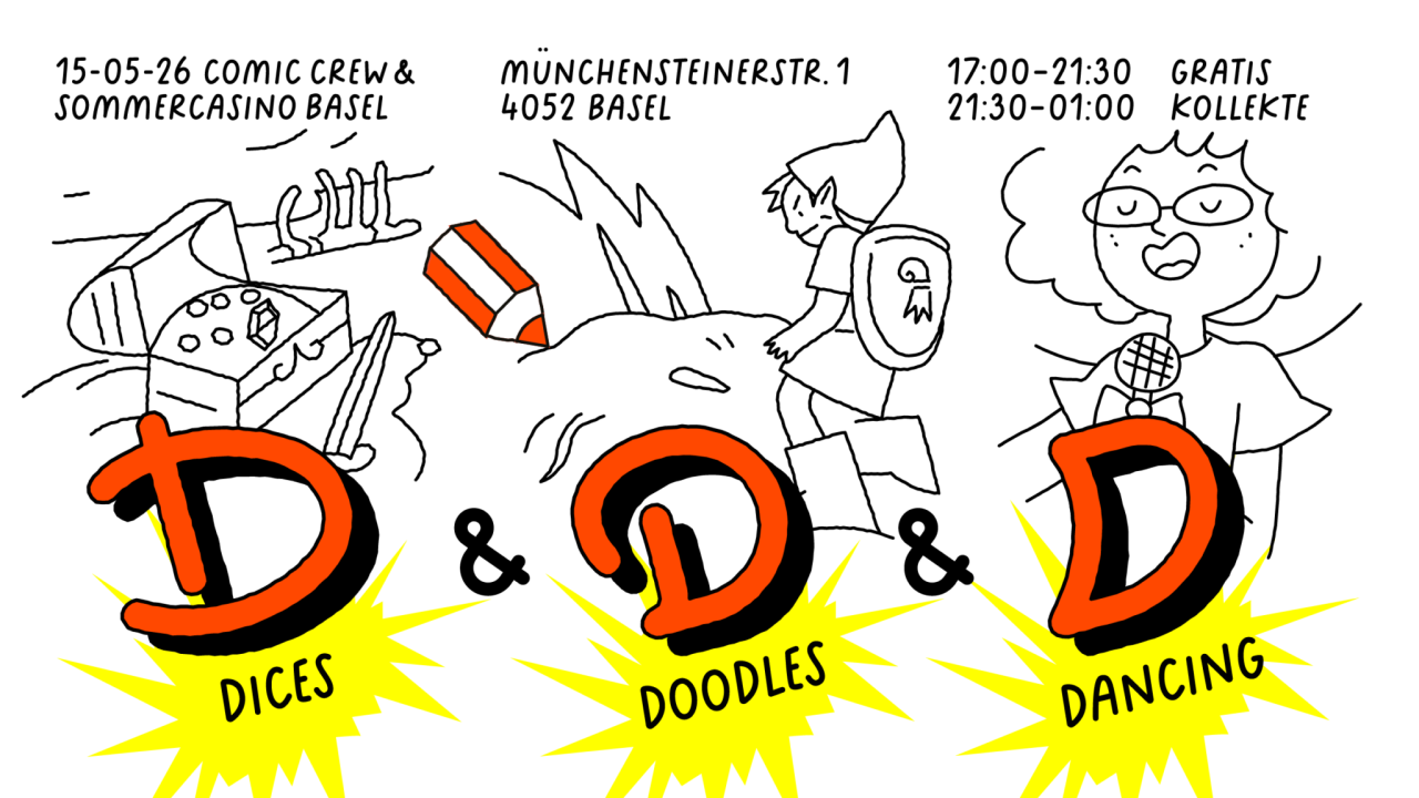 Die Comic Crew lädt ins Sommercasino Basel ein. Von Dungeons&Dragons, über Livezeichnen und Karaoke bis hin zu einem DJ-Set mit Anime- und Cartoon Openings & 2000er Hits ist alles dabei!