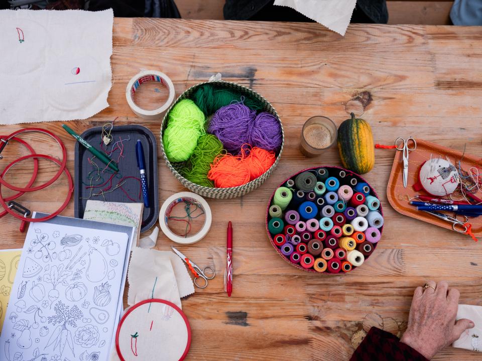 Der Stickclub vom Institut für Textiles Forschen ist «on tour»! Der nächste Halt ist auf den Feldern von plankton, wo im Sonnenuntergang gemeinsam verschiedene Motive gestickt werden. Genauso wie Gärtnern ist Sticken eine alte handwerkliche Praxis, die oft von Bäuer*innen praktiziert wurde. Das Institut für Textiles Forschen vermittelt das Handwerk in einem niederschwelligen Angebot, bei dem alle Menschen willkommen sind. Egal ob Stickprofis oder neugierige Anfänger*innen.