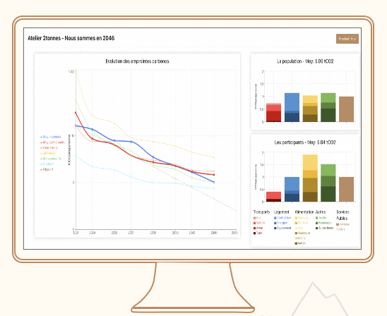 In 3 hours, together in a team, discover the individual and collective levers of the transition to a low-carbon society! The game is based on a powerful interactive digital platform that shows in real time how your carbon footprint is reducing over time, depending on the decisions made in the different rounds during the workshop.